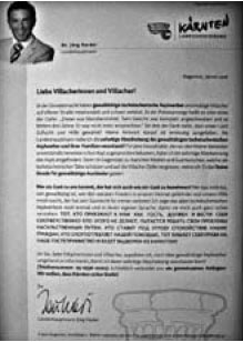 Gänzlich anders formulierte das Jörg Haider, als er sich zwei Wochen später via Zeitungsinserat an die „lieben Villacherinnen und Villacher“ richtete: „Wer den sozialen Frieden unserer Heimat gefährdet und unsere Hilfe missbraucht, der hat sein Gastrecht für immer verloren!“ Die BewohnerInnen seien aufgerufen, „mich über gewalttätige Asylwerber umgehend zu informieren, damit ich deren sofortige Abschiebung veranlassen kann!“